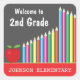 This square sticker features a chalkboard background accented with coloured pencils and a red apple. Customizable text reads: Welcome to 2nd Grade...Johnson Elementary. This sticker can be used for any elementary grade level.