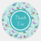 A thank you sticker for a any occasion. The background is a multicolored watercolor pattern with various wild and exotic birds. Some have their wings extended, flapping their wings others standing still. Colours include baby blue, pastel pink, purple and a warm golden orange colour on their chest. The colours beautifully mix and blend together. A pretty and unique artistic design. The centre has a teal green circle with a white inner border, which says thank you in white in an elgant font.