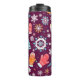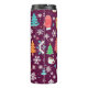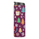 The image is a pattern of colourful Christmas-themed illustrations on a dark purple background. The illustrations include: Christmas trees in various colours and styles, some decorated with baubles, snowflakes in different sizes and shapes, scattered throughout the pattern, mittens with different knitted patterns in bright colours and mugs filled with steaming hot drinks, some with festive designs. The overall effect is cheerful, festive, and evocative of the winter holiday season.