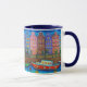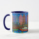 A vibrant and lively stylized night scene of Amsterdam's colourful, narrow houses along the canals on a mug by popular artist Lisa Lorenz©