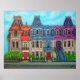 Vibrant, stylized painting of the colourful Victorian row houses on Saint-Louis Square in The Plateau district of Montreal, Quebec, by Lisa Lorenz