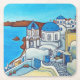Vibrant, stylized painting of beautiful Santorini, Greece with its majestic blue dome by popular artist Lisa Lorenz on a coaster.