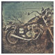 Motorcycle creatively edited image with a distressed feel has a background of faded blue and black border. Suited for quilting or crafting.