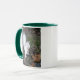 This combo mug features a double-sided design of a rare western NC white squirrel on white mug with green handle and rim.