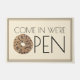 Design features an original marker illustration of a delicious everything bagel, topped with poppy seeds, sesame seeds, onion flakes, salt, and lots of garlic, and COME IN WE'RE OPEN in a fun font. Perfect for a bakery, cafe, coffee shop or deli.