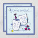 Comedy and tragedy masks decorate this invitation to a theatre birthday party. For matching items type "penguincornerstore masks" into the Zazzle search bar.