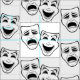 Vector illustration of comedy and tragedy theatre masks in black line. Tags: acting, actor, cinema, comedy, drama, film, frown, grief, happy, humour, joy, laugh, mask, movies, performance, sad, theatre, tragedy, smile, theatre