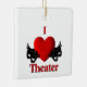 I Heart theatre with masks of comedy and tragedy on either side of the big red heart.