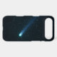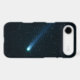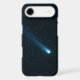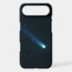A blazing comet creates a brilliant fuzzy ball in the night sky, followed by a blue wispy tail as it moves slowly among the stars in this enhanced stellar view.
