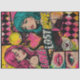 Bright hot pink, teal, yellow, and black create a vibrant pop art look with grunge splatter effects and vintage comic-inspired elements. The layout is a multi-panel collage, making it ideal for statement pieces and mixed media designs.