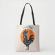 A cartoon black rooster with an enormous comb is getting ready to crow in front of a big, orange sun on this fun tote bag that's perfect for chicken lovers.