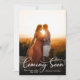 Coming Soon Photo Pregnancy Announcement Cards. Expecting parents! Modern white swirly hand lettered typography "Coming Soon!" script card to share your happy news with family and friends. Features a white handwritten script on full photo. At the backing black and white swirly floral pattern background. You can personalize the design by replacing the sample text and vertical photo. #3343 If You need help or matching items please contact to me!