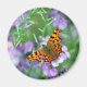 A vivid Comma butterfly (Polygonia c-album) is set against a background of purple flowers in an English garden.