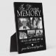 Personalized family memorial plaque featuring a stylish black background that can be changed to any color, 5 photos of your lost loved one, the text "in loving memory", their name, birth/death dates, a white heart, and the remembrance saying "gone but never forgotten".