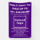 Bonne Saint Patrick’s Day ! Un autre jour férié pour célébrer cette Marche et faire de la publicité pour votre entreprise ou pour promouvoir votre marque. Le vert est toujours la couleur de ce séjour mais essayez aussi d'autres couleurs. Bannière violette personnalisable avec Saint Patrick Sale, votre nom d'entreprise et d'autres informations. Il peut s'agir de la couleur qui correspond à votre schéma de couleurs d'entreprise. Bannière que vous pouvez utiliser comme matériel marketing pour attirer plus de clients. Customisez-le et affichez-le pour convaincre plus de clients d'acheter vos produits ou clients d'aimer vos services. Les contenus sont des salutations de la Joyeuse Saint Patrick, des textes de vente avec pourcentage de réduction que vous offrirez, des dates de vente, votre nom d’entreprise, logo, adresse, numéro de téléphone, courriel et site Web ou votre page de médias sociaux d’affaires. Veuillez vérifier l'apparence après avoir téléchargé le logo et tapé des textes. Si l'apparence vous plaît, vous pouvez passer votre commande maintenant. Si vous avez besoin de redimensionner et déplacer le logo et les textes pour tenir sur cette bannière ou sur la taille que vous choisirez, s'il vous plaît changer dans l'outil de conception. Vous pouvez également modifier la couleur arrière - plan, la couleur de police et le style de police dans l'outil de conception. Je vous souhaite le meilleur de la chance, de la joie et plus de ventes ce jour férié.