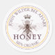 An elegant honey label featuring a beautiful ghosted double bee graphic logo in earthy brown and yellow gold, for a commercial honey beekeeping apiary.