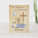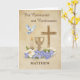 Celebrate a meaningful step in faith with this elegant Communion and Confirmation card, personalized with the recipient’s name on the front. Featuring a beautiful arrangement of Christian symbols—including a cross, chalice, candle and dove—this design reflects the sacred significance of these holy sacraments. A soft tan background with subtle texture adds warmth and grace, making it a cherished keepsake. Inside, a heartfelt message offers blessings and congratulations, perfect for commemorating this special occasion.