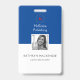 Blue and White Background photo Name Badge. Logo. Vertical. Black and white filter applied to photo.