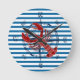 Bright blue and white horizontal pattern design round wall clock with a nautical theme features a lobster and a ship compass!
