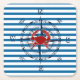 Set of paper coasters with blue and white stripe design with nautical theme featuring a ship compass and red crab!