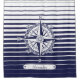 A shower curtain featuring a nautical design with an ornate compass rose on blue and white stripes and a label with customizable text.