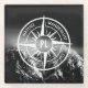 Compass star with black and white photograph of dramatic snowy mountains with milky clouds. With emblems wanderlust, nature, travel and explore that are customizable so you can write your own texts. In the centre of the star is a personalized monogram. Perfect for nature lovers hikers and travellers.