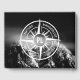 Compass star with black and white photograph of dramatic snowy mountains with milky clouds. With emblems wanderlust, nature, travel and explore that are customizable so you can write your own texts. In the centre of the star is a personalized monogram. Perfect for nature lovers hikers and travellers.