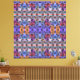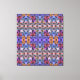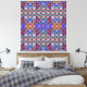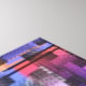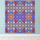 A complex, geometric pattern features vibrant hues of purple, blue, orange, and pink, set against a grey background. The design creates a symmetrical, visually dynamic effect.