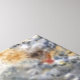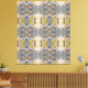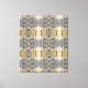A symmetrical pattern features a blend of colours including grey, yellow, and orange, creating a kaleidoscopic effect. The repeating design gives a sense of complexity and movement.