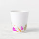Cette tasse présente dans sa bordure inférieure un ensemble de lames et de fleurs en beige, magenta, rouge et orange sur l'arrière - plan blanc.