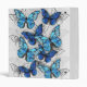Vertical composition of realistic, blue and white morpho butterflies on grey textured background. Morpho blue butterfly.