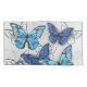 Vertical composition of realistic, blue and white morpho butterflies on grey textured background. Morpho blue butterfly.