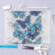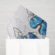Vertical composition of realistic, blue and white morpho butterflies on grey textured background. Morpho blue butterfly.