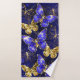 Composition of luxurious sapphire and gold jewellery butterflies on blue textured background.