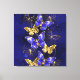 Composition of luxurious sapphire and gold jewellery butterflies on blue textured background.