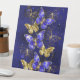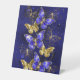 Composition of luxurious sapphire and gold jewellery butterflies on blue textured background.