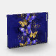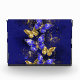 Composition of luxurious sapphire and gold jewellery butterflies on blue textured background.