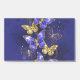 Composition of luxurious sapphire and gold jewellery butterflies on blue textured background.