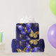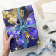 Composition of luxurious sapphire and gold jewellery butterflies on blue textured background.