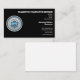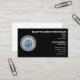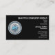 A computer monitor, a settings gear icon with cables in a white circle on a black background makes a sharp and professional business card for a computer repair shop. Could also be used for a data recovery service, computer system builder, IT guru, or computer sales.