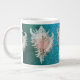 A delicately pink tinted conch shell so realistic you can almost hear the ocean, on a vibrant ocean blue background.