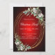 A red gradient background decorated with cones, white berries and greenry. A faux gold oval frame. Personalize and add the details.