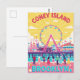 Bright, retro illustration of Coney Island, Brooklyn, featuring a large Ferris wheel and a vibrant boardwalk scene with people looking out over the water.