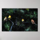 Very early in the morning, these four goldfinches were perched on top of the feeder pole waiting for someone to put out their breakfast! It seems to be a family with Mother on the right, then a juvenile, then Dad, and then another young one on the left. The low sun rays from the early day light illuminated the group while keeping the background trees in darkness.