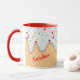 Here's a fun mug that makes a great birthday present when filled with the recipient's favourite candy! The pattern is a waffle cone background with white icing. The icing is filled with colourful confetti dots. One side has a custom name in red.