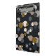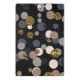 A pattern of random confetti dots in a pastel peach, maple brown and grey palette, with gold glitter on a dark background. Personalize with an initial.