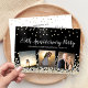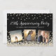 Elegant custom anniversary party invitation design featuring gold and silver confetti over a black background, modern script typography with the words "25th Anniversary Party", your name and anniversary date (in silver) and three of your favourite photos framed in metallic silver foil. Personalize it with your party details on the back of the invitation.