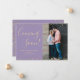 Gold Confetti on Light Purple Custom Photo Pregnancy Announcement Cards. Expecting parents! Modern hand lettered typography "coming soon" script card to share your happy news with friends and family. Features above and the bottom gold confetti frame on light lavender purple colour background. You can personalize the design by replacing the simple texts and vertical photo. If you need help or matching items, please contact to me! #3351