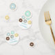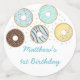 Ce joli confetti de table d'anniversaire présente nos beignets dessinés à la main dans des couleurs pastel avec des confettis saupoudrés.