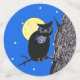 Ce confetti de table a un hibou noir aux yeux bleus assis dans un arbre noir avec une pleine lune jaune et des étoiles sur un arrière - plan de ciel bleu nuit. Les cercles moyens ont une étoile jaune et les petits cercles ont un croissant de lune.